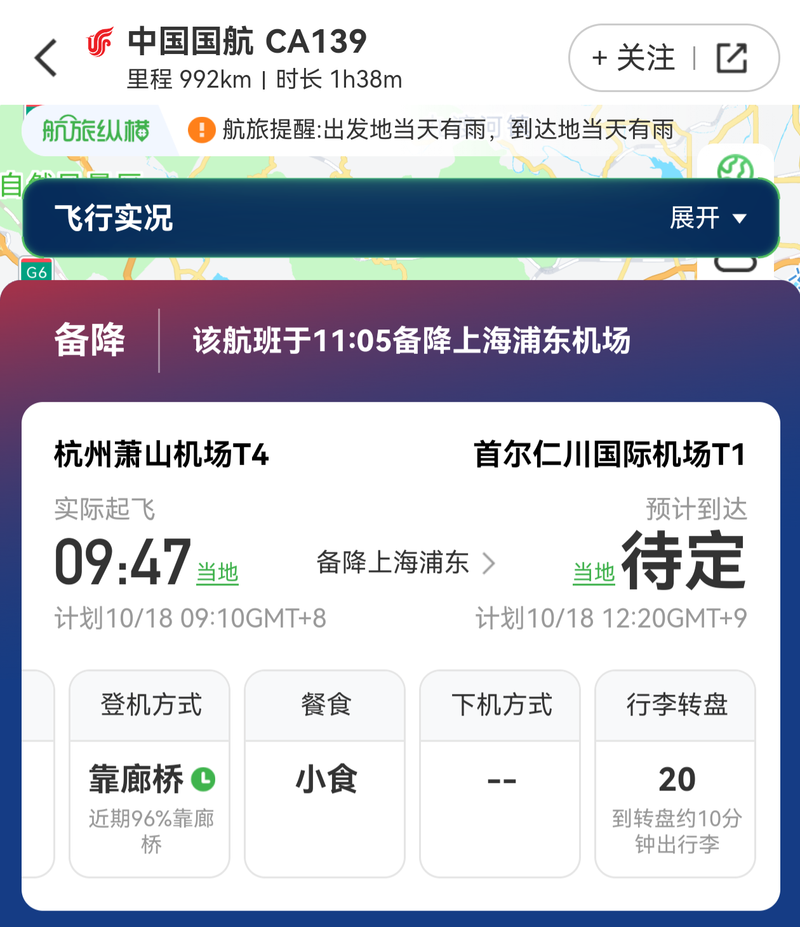 新京报贝壳财经讯(记者 于金明)10月18日,有网友发布视频称,国航CA139航班从杭州飞往韩国首尔时,行李舱内冒烟起火。机组人员迅速扑灭大火后,飞机备降上海浦东国际机场。国航客服告诉贝壳财经记者,10月18日,杭州飞往仁川的CA139航班上一名旅客存放在行李架中的行李中,锂电池自燃。机组人员立即按照程序解决了该事件,没有造成人员受伤。为保证飞行安全,飞机备降上海浦东机场。国航已调派飞机继续运营。 10月18日11时05分,CA139航班备降上海浦东国际机场。航旅纵横APP截图。 6月28日起,民航局新规针对旅客携带便携式电池的离子规定将正式生效。根据新规定,旅客将不能携带无“3C”认证标志、标志不清晰或召回型号、批次的手机电池乘坐国内航班。但该规则不适用于国外航班。编辑 陈力 校对 林超