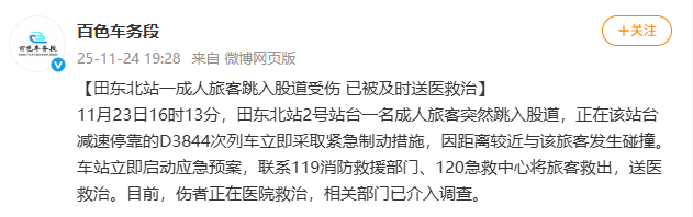 据新京报@百色列车服务版块微博消息,11月23日16时13分,田东北站2号站台上的一名成年乘客突然跳轨。正在站台减速停车的D3844次列车,由于车厢间距较短,立即紧急制动,与乘客相撞。车站立即启动应急预案,呼叫119消防救援中队、120急救中心对乘客进行救援和救治。目前伤者正在医院接受治疗,相关部门正在参与调查。编辑 申真